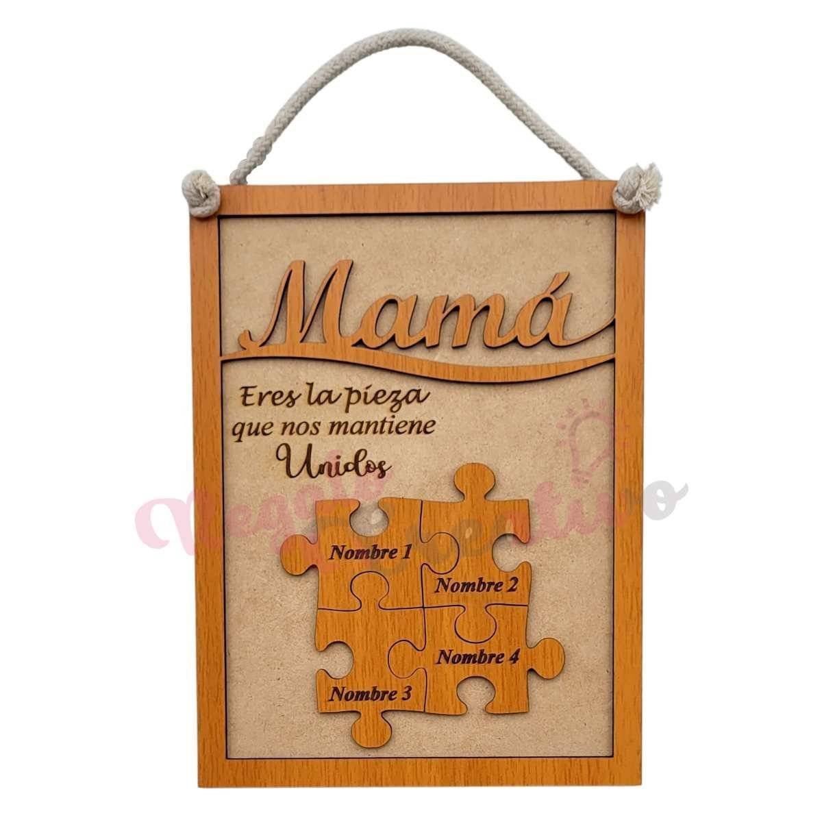 En este día de la madre tenemos muchas opciones para ti. Una de ellas es este Cuadro día de la mamá Rompecabezas, con el que puedes reflejar que es la pieza que mantiene a todos unidos. Puedes grabar desde 2 a 6 nombres, y personalizar desde 1 a 4 piezas.