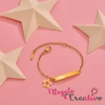 No pierdas la oportunidad de obtener esta hermosa pulsera grabada con el nombre tu bebé. Con esta destacada joya de diversos dijes y diseños, puedes comenzar su colección de objetos preciados.